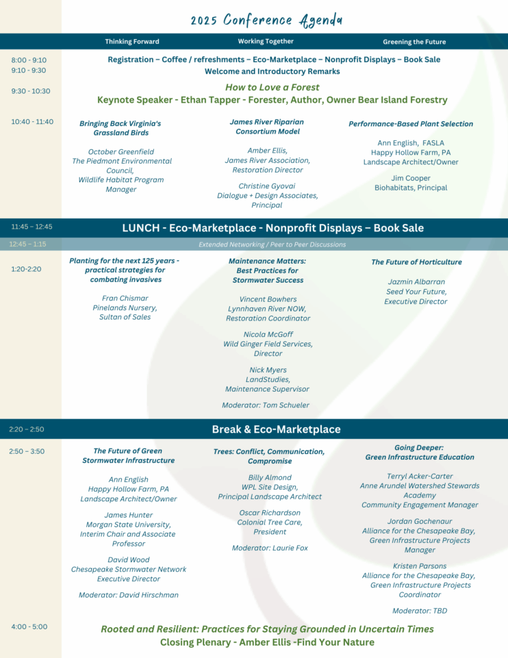 This year’s theme, “Chart the Course, Shape the Future: Together for a Greener Good,” invites you to join over 200 professionals for a high-energy day packed with innovation, collaboration, and practical takeaways you can put to work right away. From exciting keynote speaker Ethan Tapper, an internationally recognized forester and bestselling author, to inspiring plenary speaker Amber Ellis of Find Your Nature, you’ll walk away motivated, informed, and connected. Plus—earn CEUs, explore optional field days, and kick things off with a welcome dinner at one of Richmond’s most vibrant venues. Don’t miss your chance to be part of the movement that’s transforming landscapes—and communities—across the Chesapeake Bay and beyond!